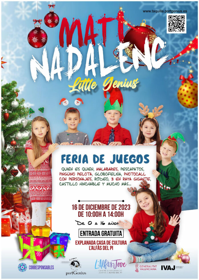 Nå lørdag 16. desember fra kl. 10.00 til 14.00 inviterer man til «Matí Nadalec», en «jule-messe» for barn og ungdom med fokus på spill og leker. Stedet er torget foran Casa de Cultura i Alfaz del Pi. Det blir «Little Genius» og et Escape Room som inkluderer julenissens verksted. Begge aktivitetene er gratis.