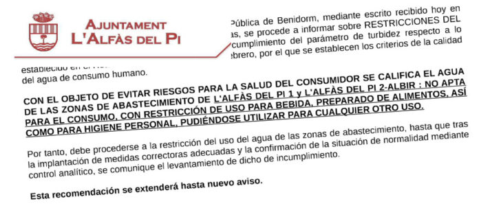 Rådhuset i Alfaz del Pi har nok en gang sendt ut et skriv som «forbyr» bruk av vann fra springen til å drikke, lage mat eller vaske seg.