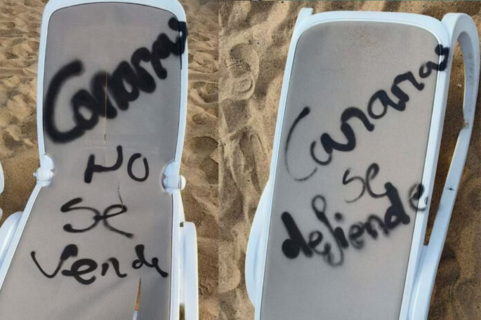 En bølge av hærverk rammet to populære strender i Los Cristianos på Tenerife i forrige uke. Mer enn 230 solsenger ble ødelagt og sprayet med anti-turisme-graffiti som «Canarias se defiende» (Kanariøyene forsvarer seg selv) og «Canarias no se vende» (Kanariøyene er ikke til salgs).