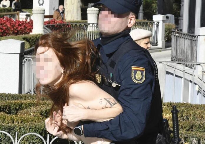 Tre kvinner med utildekkede bryster protesterte med ropene «ingen ære, ingen heder til fascismen». Ifølge klagen kom «flere politimenn, alle menn, dem i møte» da aktivistene tok av seg frakkene, og mens noen av dem gikk i gang med å arrestere to av kvinnene «med åpenbar profesjonalitet», tok en annen politimann tak i klageren bakfra og «klemte henne på brystene med begge hender» i 30 sekunder.