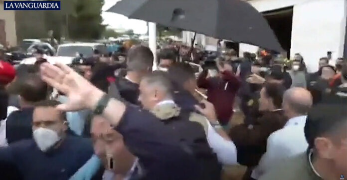 Kongens sikkerhetsvakter måtte holde en paraply foran Felipe på grunn av gjørmen som kom flyvende. På vei ut fra området ble kongens bil ramponert med slag fra stokker.