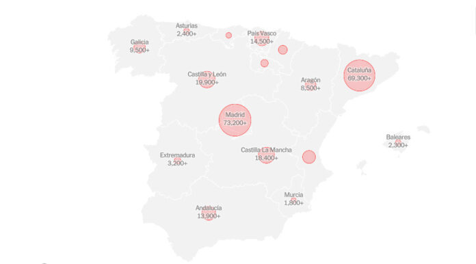 De som drar opp snittet i Spania er Madrid-regionen med en av 91 smittede, Katalonia med en av 110 og Baskerland med en av 150, Castilla y Leon med en av 121 og Navarra med en av 150.