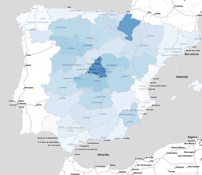 Det er igjen Madrid-regionen som drar snittet for Spania opp. Valencia regionen som inkluderer Alicante og Valencia har nå minst smitte i hele Spania. Smittede pr 100.000: