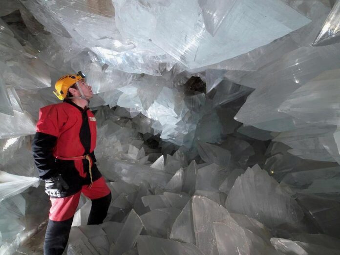 De enorme krystallene er laget av ren calcium sulfat noe som gjør dem nesten helt gjennomsiktige.