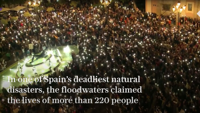 Titusener av mennesker protesterte i Valencia lørdag kveld mot de spanske myndighetenes respons på forrige ukes dødelige oversvømmelser. Demonstranter krever at Valencias president Carlos Mazón fra Partido Popular går av.