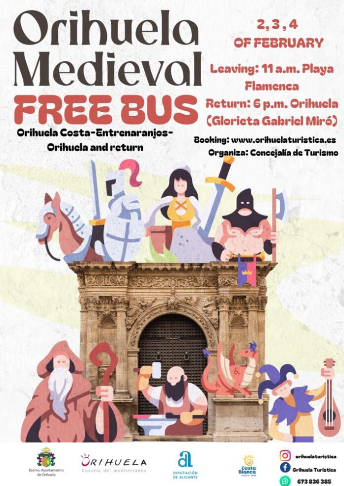 I anledning av middelaldermarkedet denne helgen er det satt opp en gratis-buss fra Orihuela Costa. Bussen går fra Playa Flamenca klokken 11.00 fredag, lørdag og søndag. Retur-bussen er klokka 18.00 fra Orihuela.