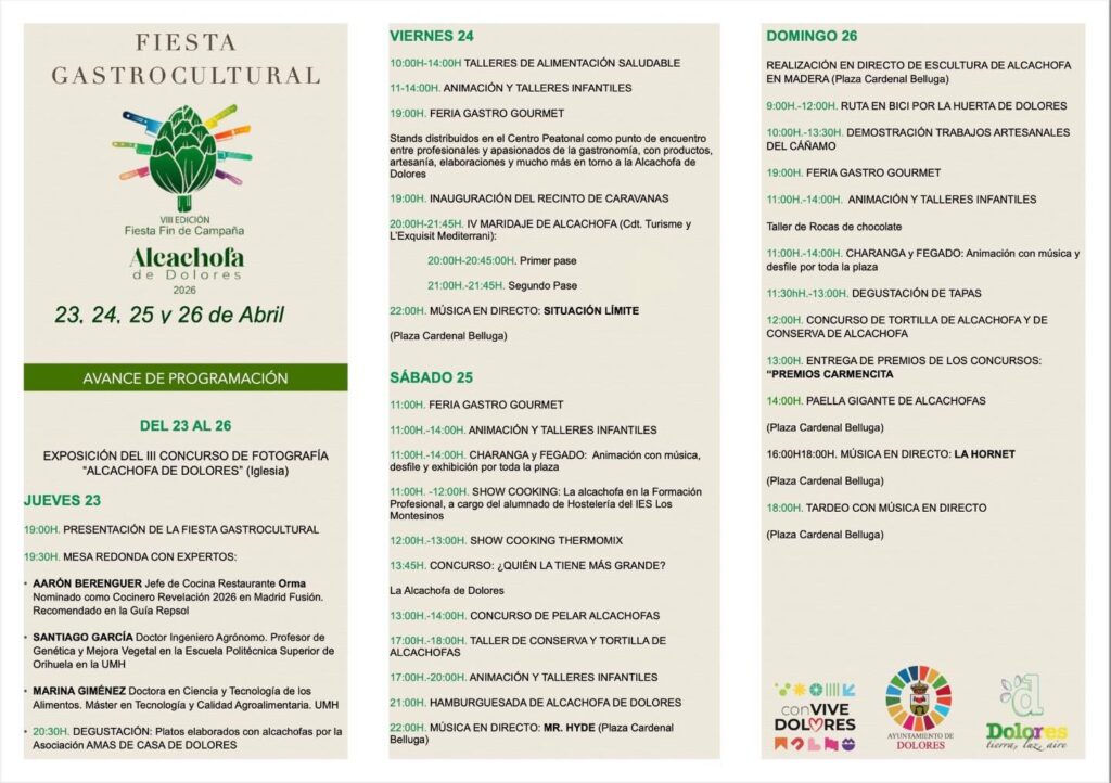 Artisjokken vil nok en gang stå i sentrum i Dolores med feiringen av den åttende årlige gastronomiske og kulturelle festivalen for sesongslutt, som finner sted fra 23. til 26. april med et bredt program som kombinerer gastronomi, tradisjon og fritidsaktiviteter for alle aldre.
