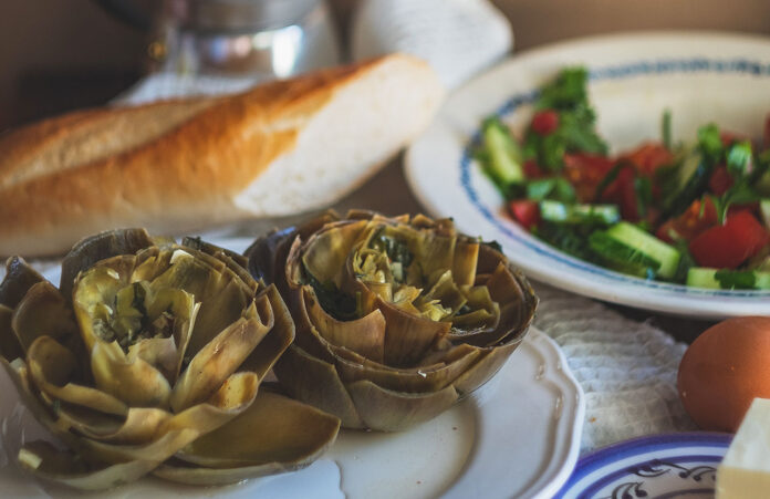 Alcachofas confitadas con vinagreta de ajo negro y virutas de cecina.