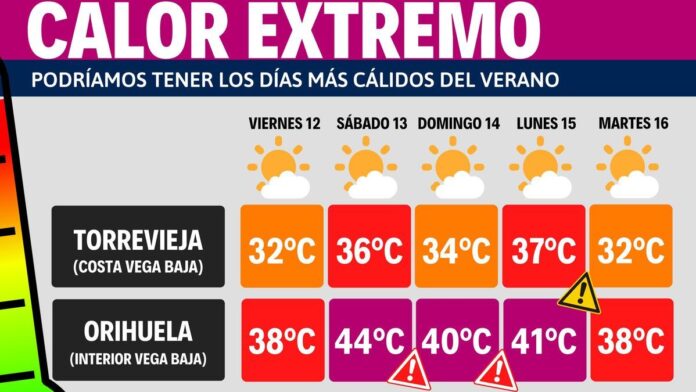 Lørdag er det meldt 44 varmegrader i Orihuela. Varmebølgen skal denne gangen være frem til onsdag neste uke. Langs kysten, blant annet i Torrevieja, forventer man temperaturer opptil 37 grader.