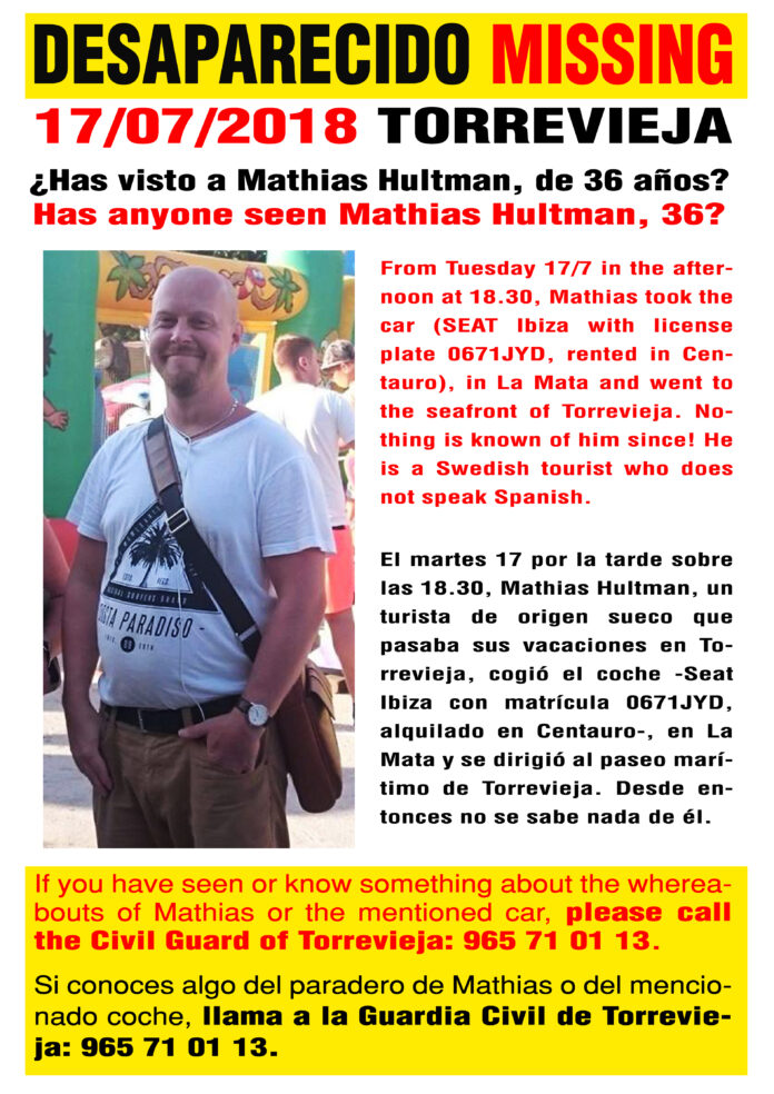 36 år gamle Mathias Hultmann ble meldt savnet i Torrevieja 17. juli hvor han har vært på ferie. Svensken ble sist sett 17. juli i leiebilen han hadde leid fra Centauro i det han kjørte fra La Mata mot sentrum av Torrevieja.